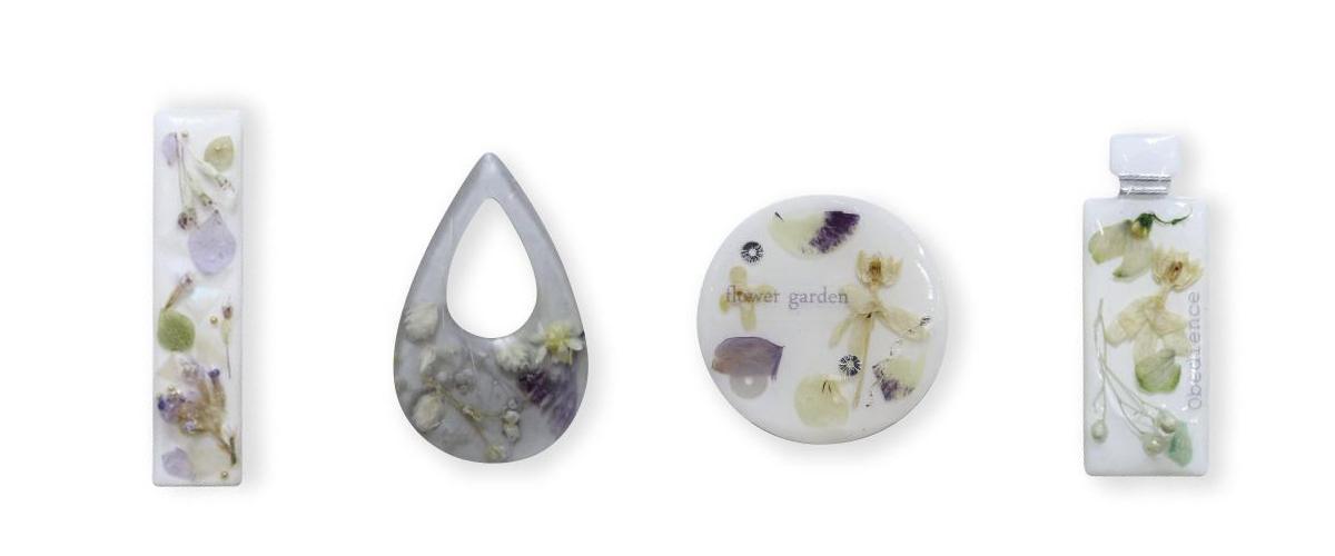 レジンで作ったフレームの内側にシリコンオイルと花を閉じ込めたハーバリウムアクセサリー。