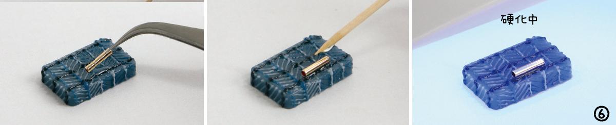6.メタルパイプをLED&UVレジンで取り付け、硬化させる。メタルパイプのきわに再度レジンをつけて硬化させ、補強して完成。