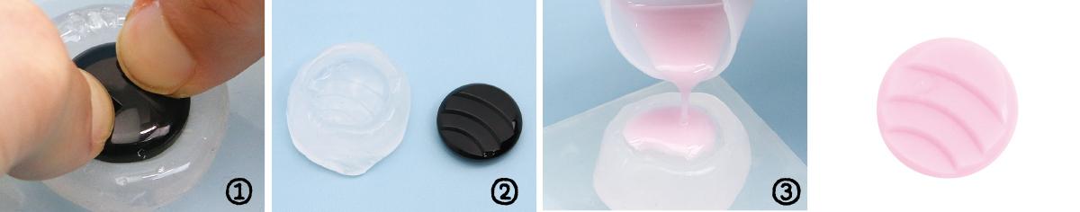 3.出来上がった型にレジン液を流し、表裏を硬化させる。型が完全に冷めたら、出来上がったパーツを取り出す。