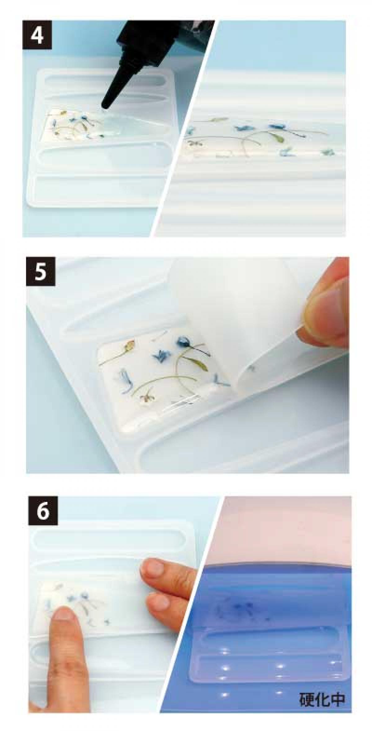 2.モールドの内側から着色剤で着色したレジンB、反対側から無着色のレジンを流し入れる。無着色のレジン側にドライフラワーを配置する。
