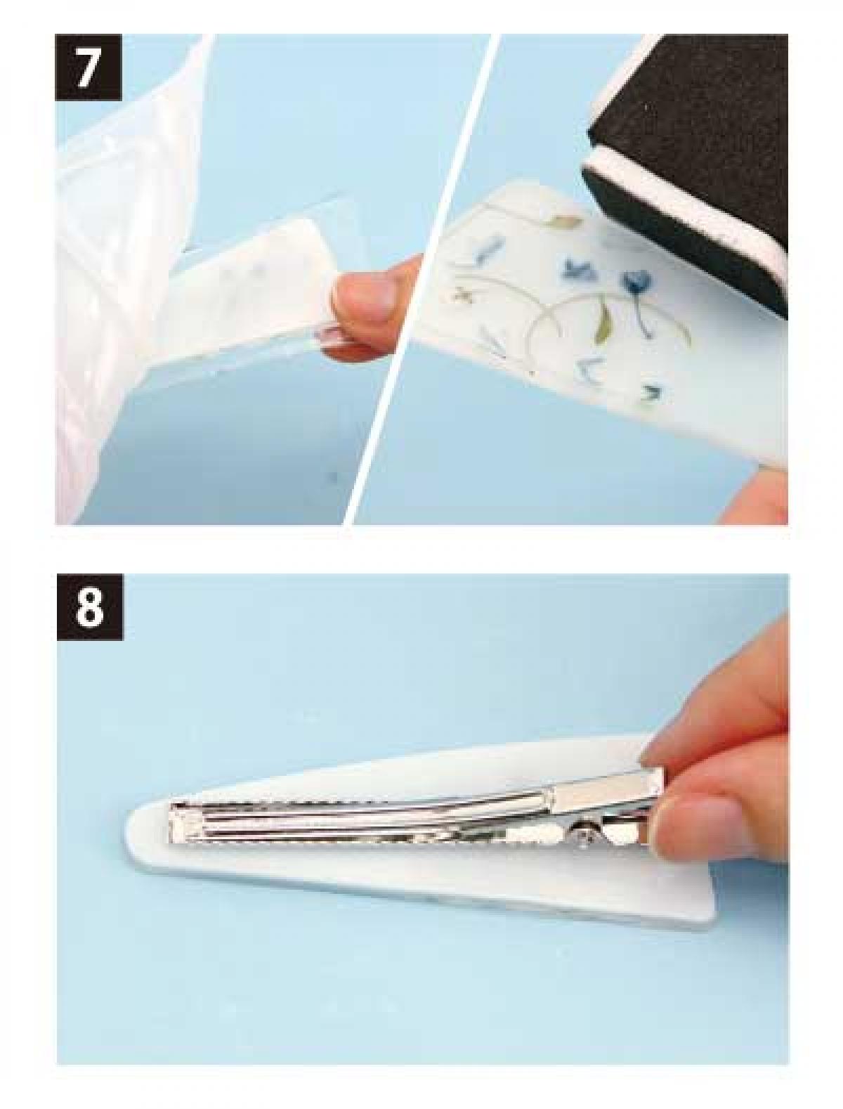 8.できあがったパーツを裏向きに置き、接着剤でクリップを取り付ける。