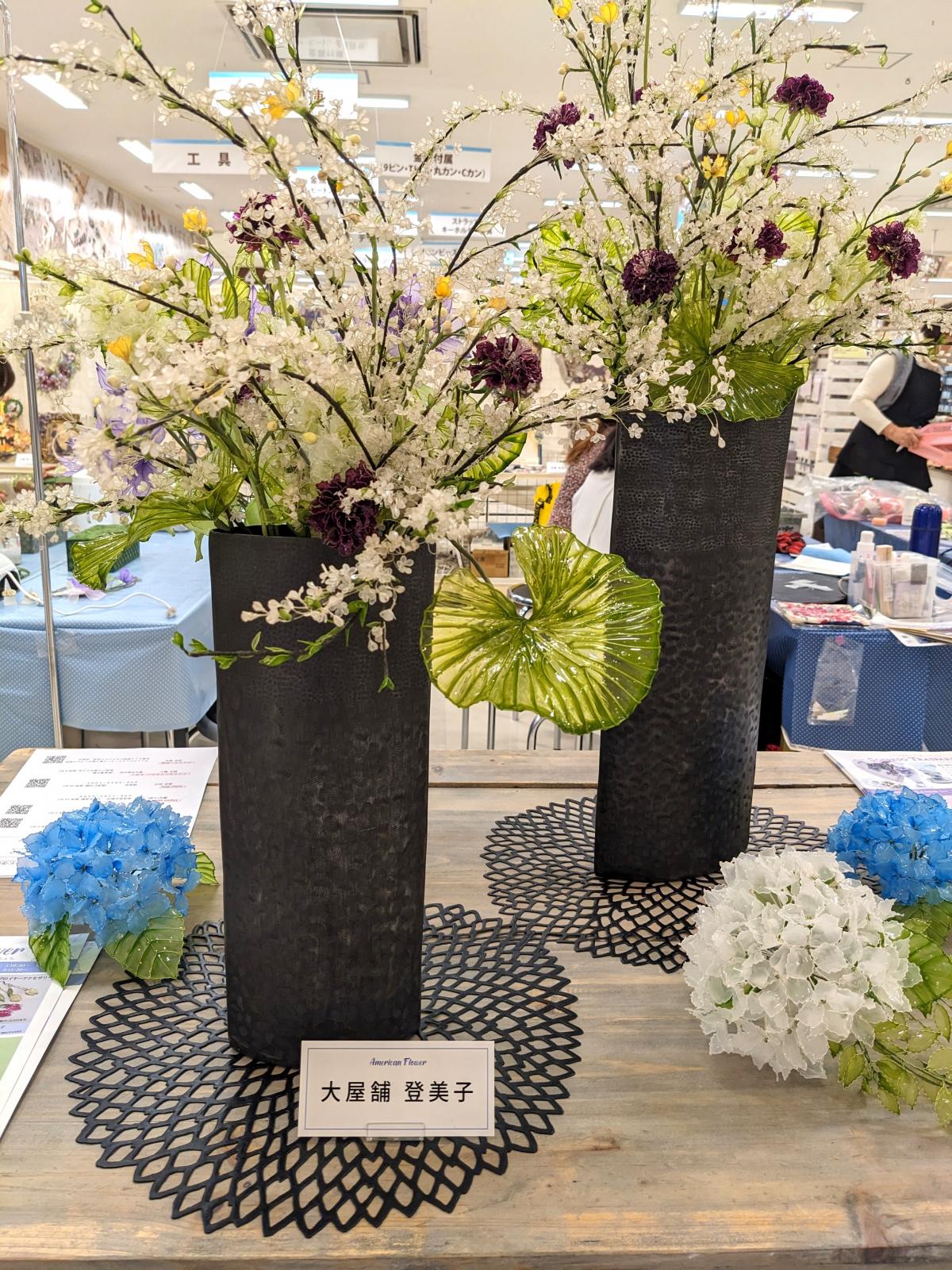 先生方とお客様が、笑顔で和気あいあいとアメリカンフラワーの作品たちに囲まれて、