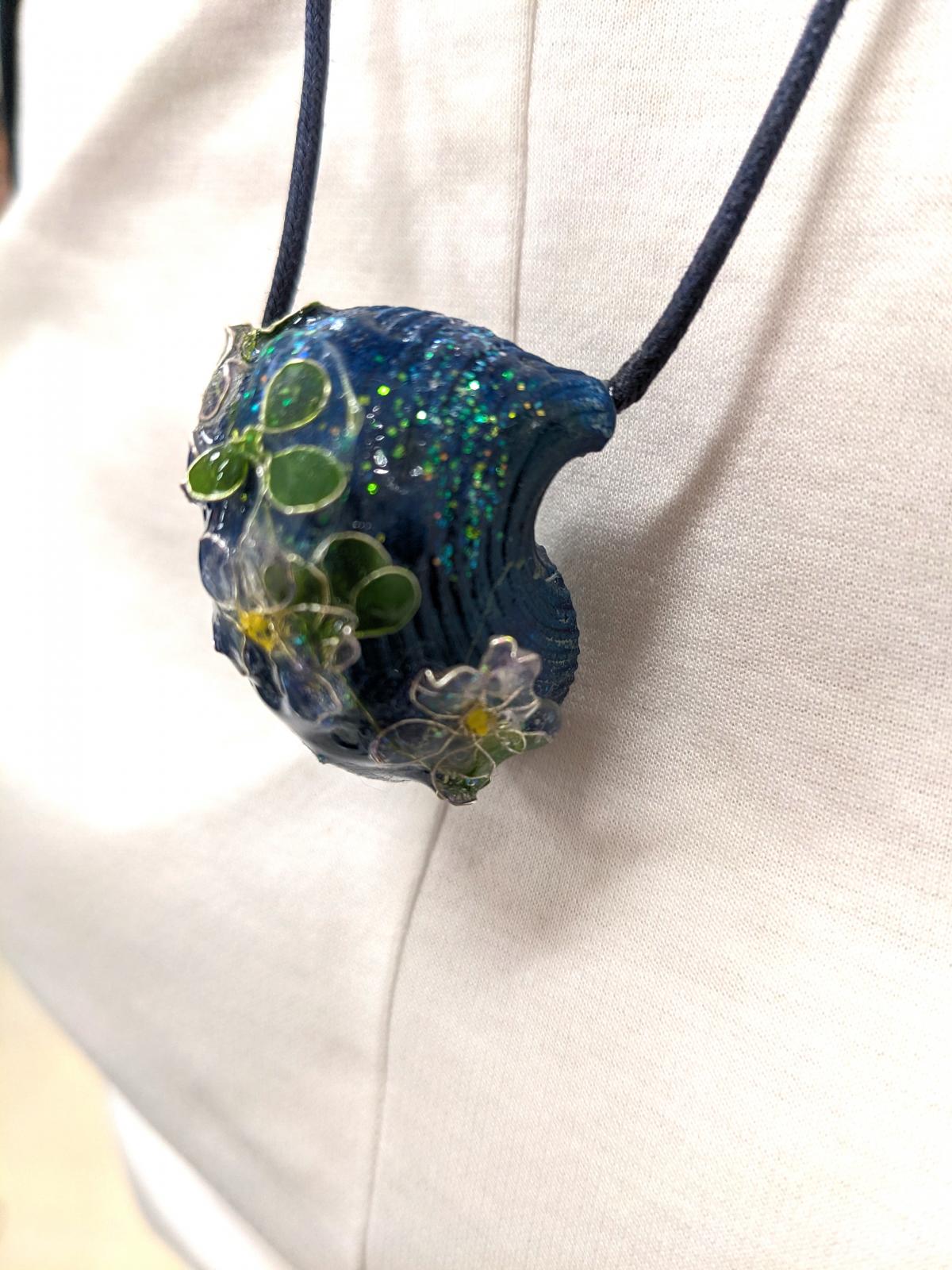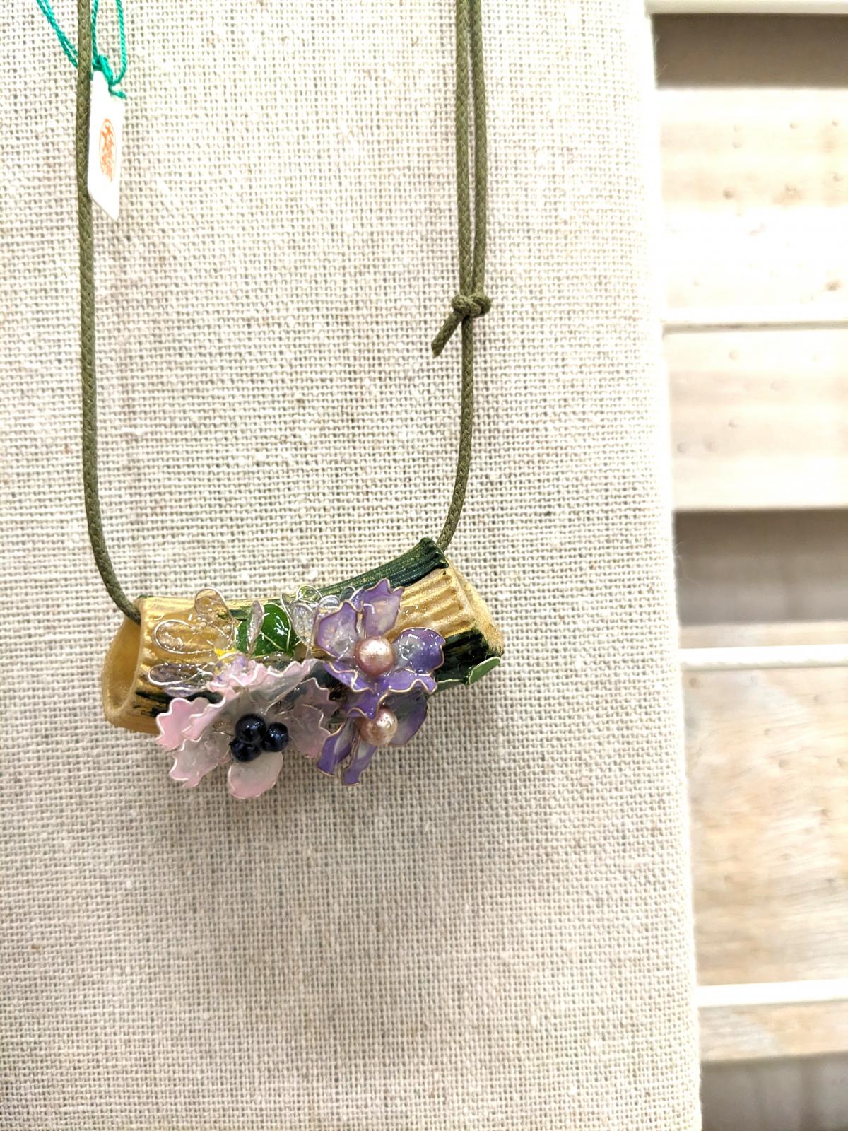ワークショップ講師の大屋敷登美子先生の作品は、アメリカンフラワー×マカロニがネックレスになっていました!