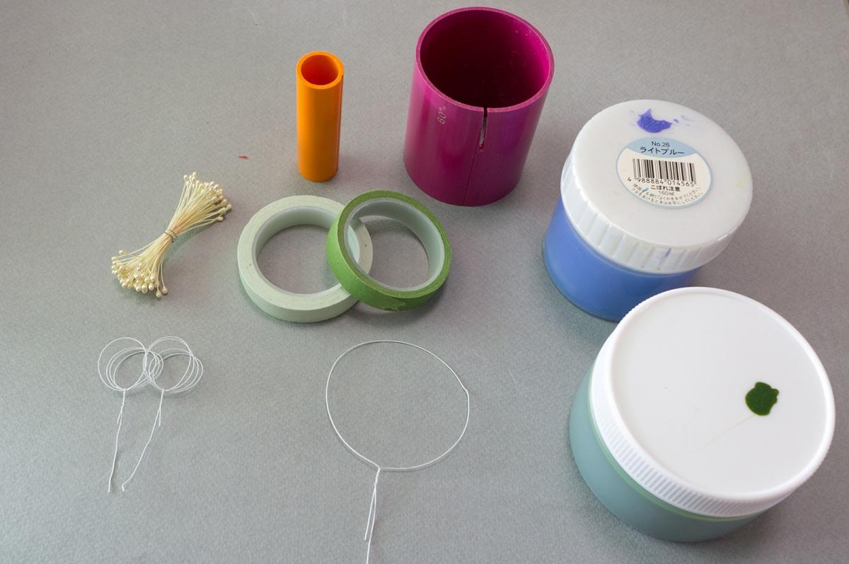 ゲージパイプ(直径6cm、2cm)、イバラベップ中(黄)、ペンチ、ハサミ、スタイルフォーム