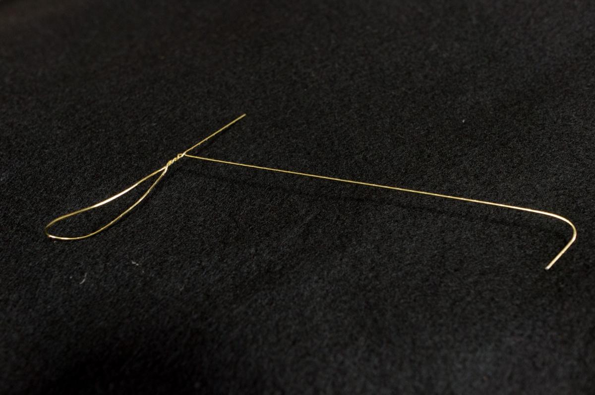 2.5cmのゲージで輪を作り細長く形を整え少しカーブをつけます。ねじった部分の片側は、約2cmくらい。ここが後で口の部分になります。