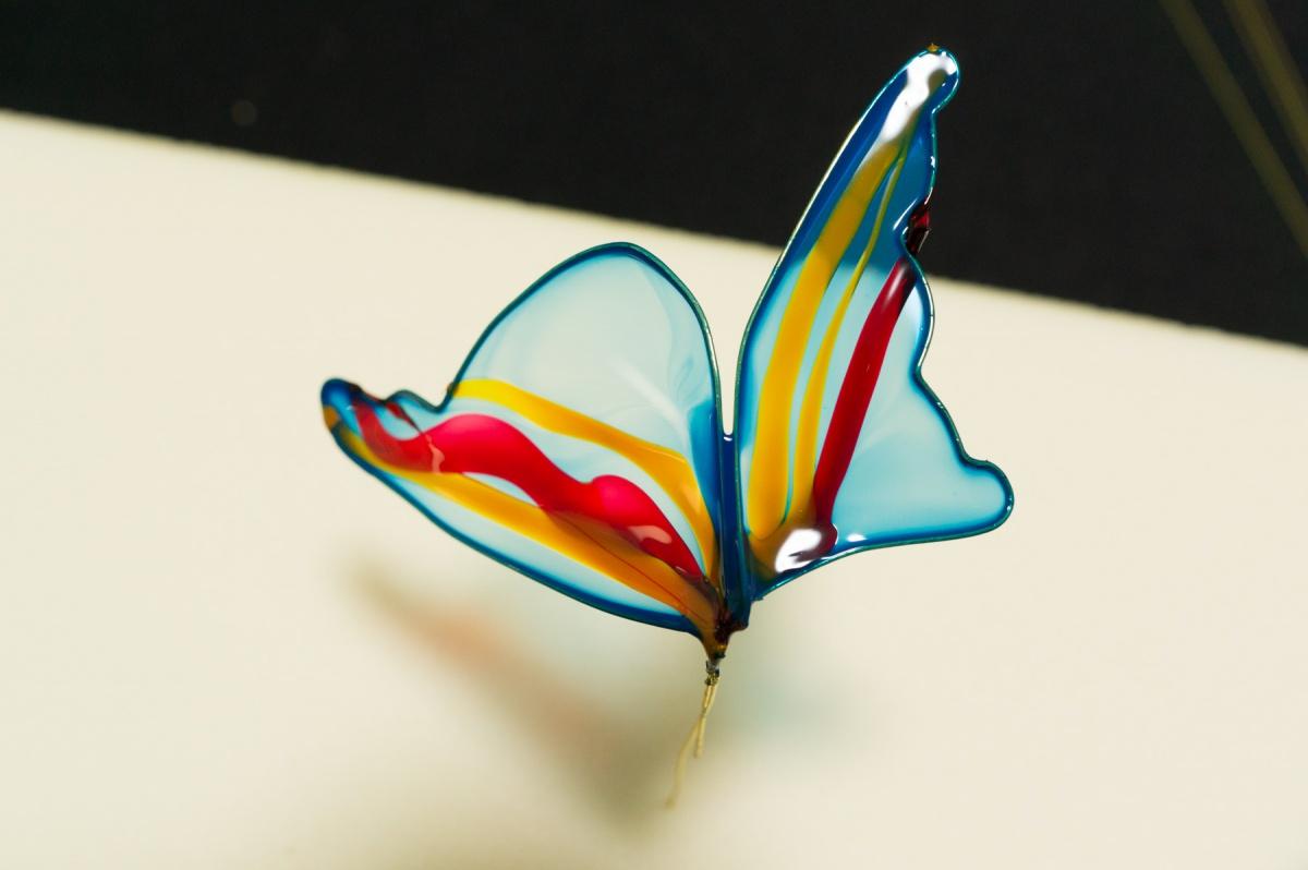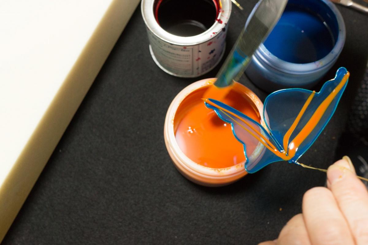 乾いたら、別の色を羽に垂らして模様を描きます。複数の色が混ざり合うようにすれば複雑な模様になります。決まった模様でなくていいので自由にきれいな模様を描いてください。