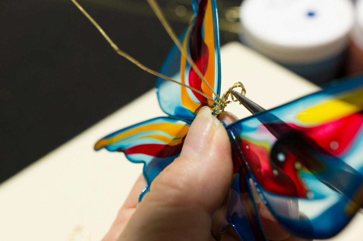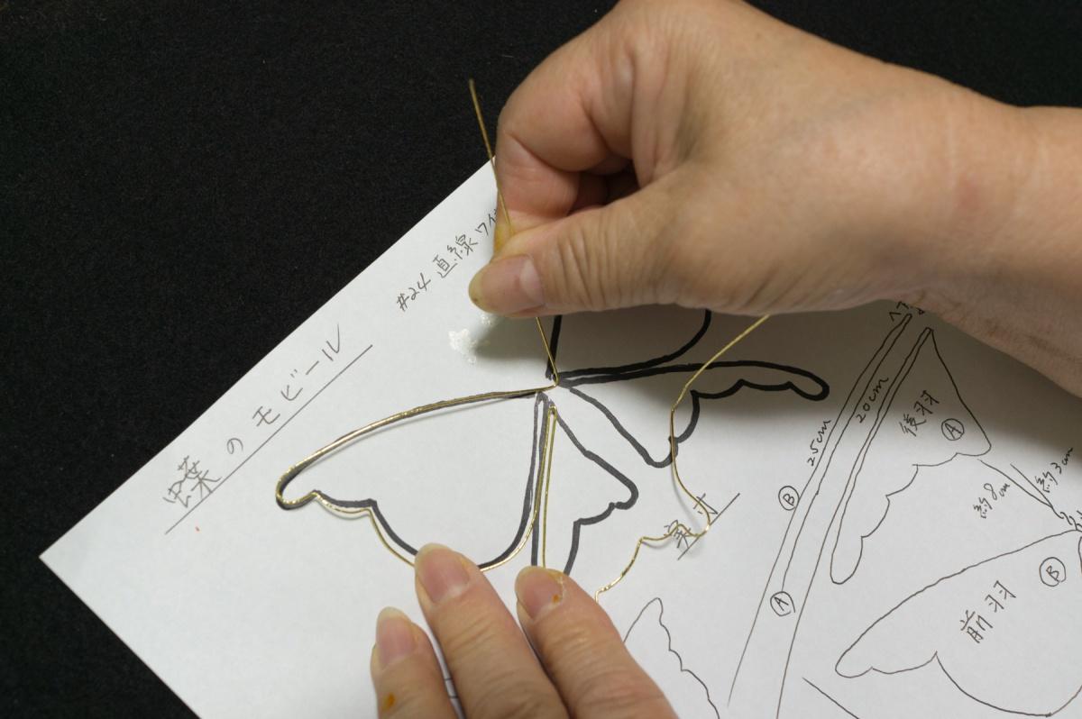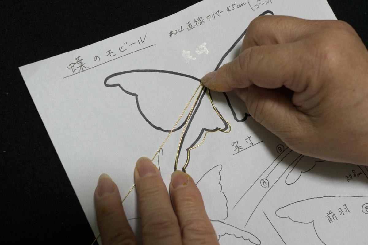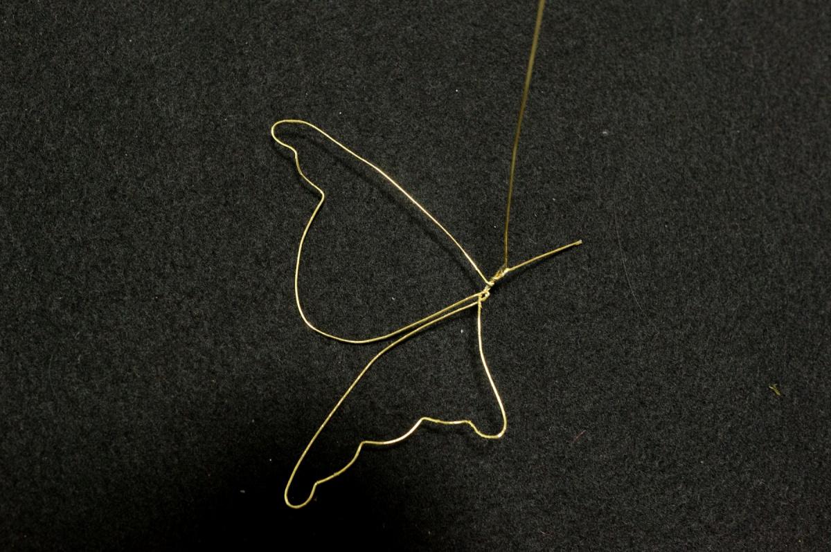 左右の羽のワイヤーの残った部分をねじって、短い側の余った部分はカット、長い方は先を曲げて触覚にします。左右の羽の中央に胴体を付けます。胴体のワイヤーの長い方はモービルを吊るす部分として使います。