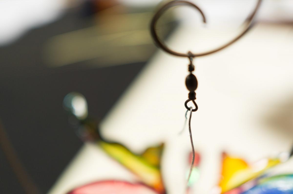 モービルの吊るす部分に、釣に道具に使う「スイベル(サルカン)」という両端に輪が付いてくるくると回るものを取り付けておくと、空気の動きで蝶がくるくると回るようになります。