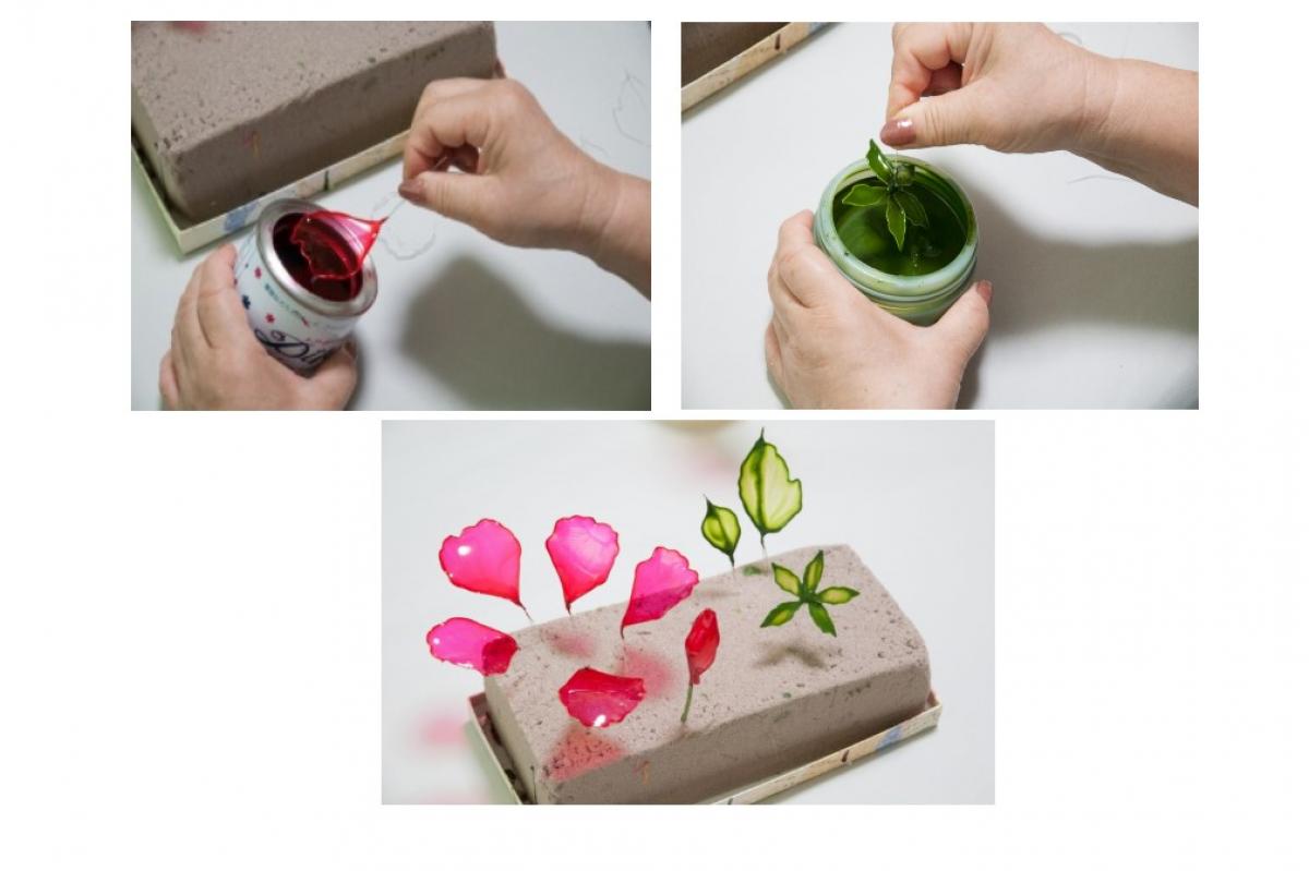 花びらと葉、ガクにそれぞれ液を付けて乾かします。