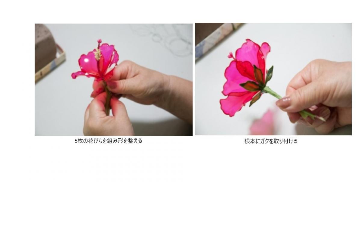 南国の夏のイメージのハイビスカス。写真や実際の花をじっくりと観察して特徴をとらえてみましょう。今回の作例では、レッド(No.7)のディップ液で作ります。