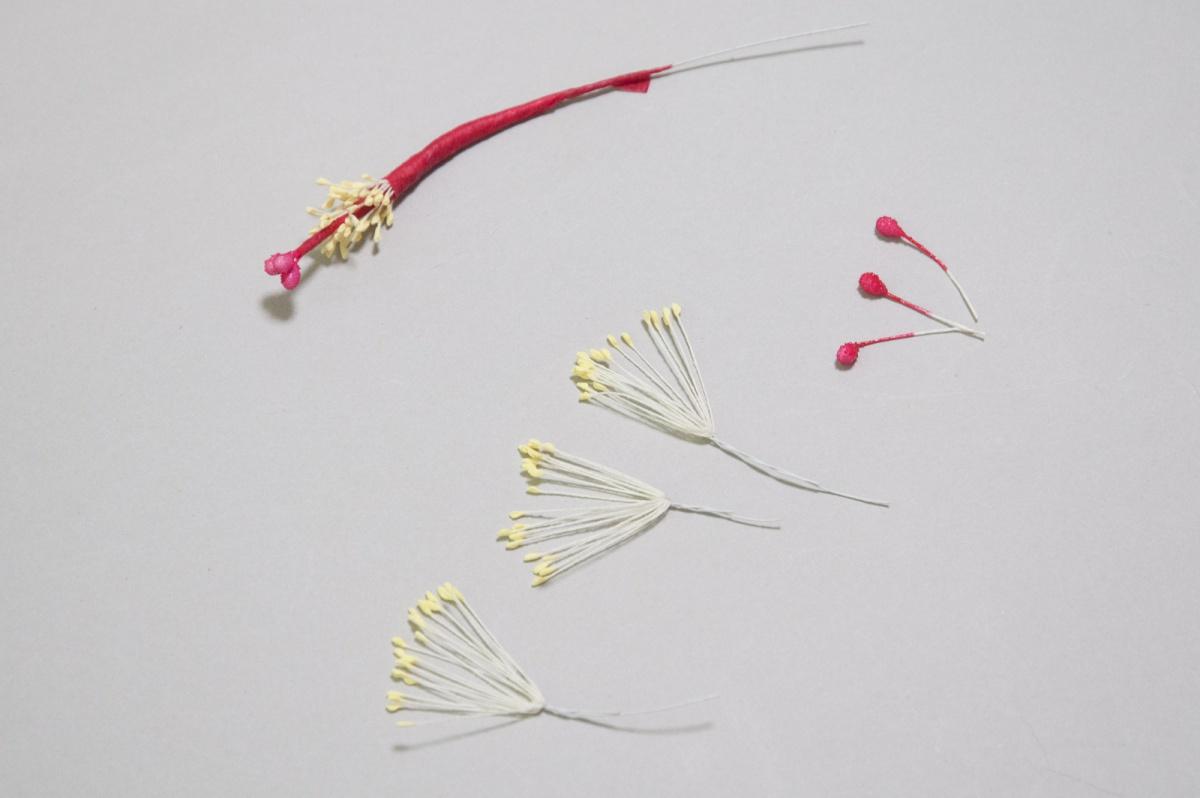 おしべ用にペップ(小)10本くくったものを3組用意し、1組づつずらしてめしべの芯に取り付けます。取り付けたら、おしべ用のペップを指で外側に開きます。