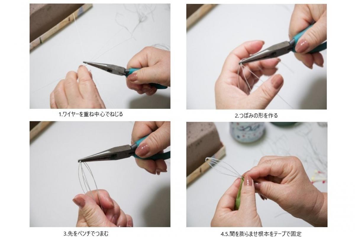 8.2〜3cmに切ったものを対角線で2つに切り先をこより状によじる。5つ作る。