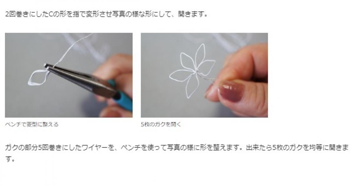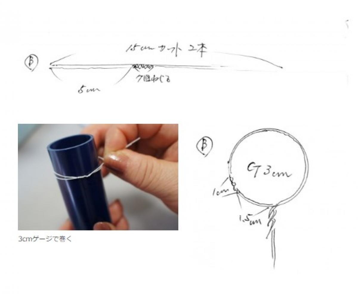 内側の花びら(B)の準備。Aと同様に15cmに切った#30ワイヤー2本を、端から5cmくらいのところで7回(1cm幅)くらいねじります。そのワイヤーを3cmのゲージで巻きます。