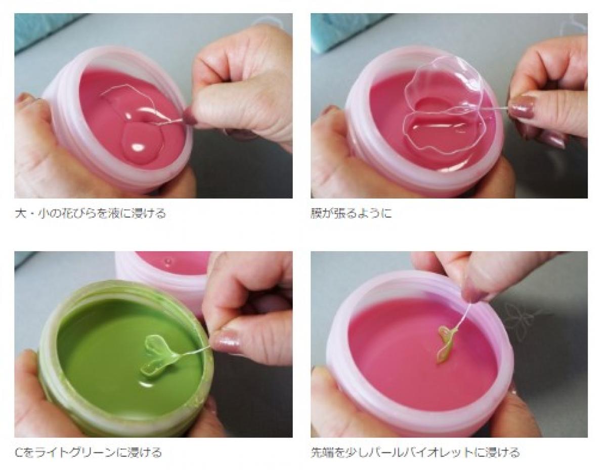 A・Bの花びらをパールバイオレット(No.24)のディップ液に浸けます。
