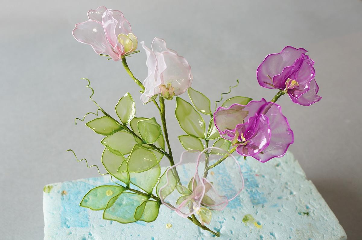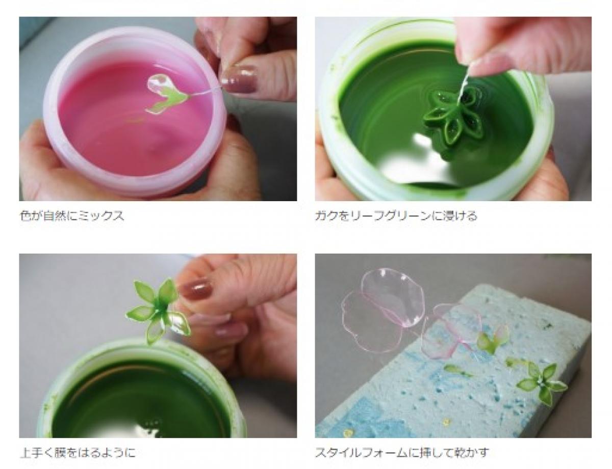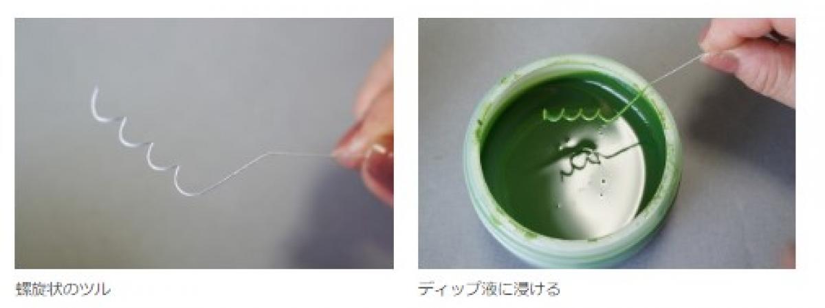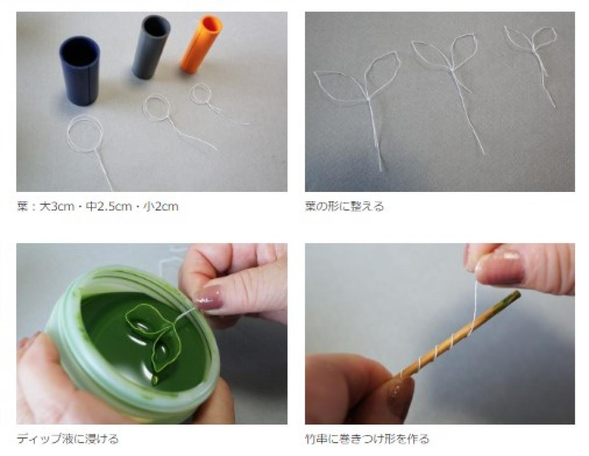 ツルは、#30ワイヤーを竹串などにクルクルと巻きつけ螺旋の形を作ります。それをディップ液に浸けて準備完了です。スタイルフォームに挿してしばらく乾かします。
