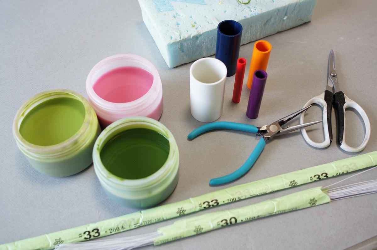 その他 ゲージパイプ(直径4cm、3cm、2.5cm、1.5cm、1cm)、イバラベップ中(黄)、ペンチ、ハサミ、 スタイルフォーム、定規、竹串