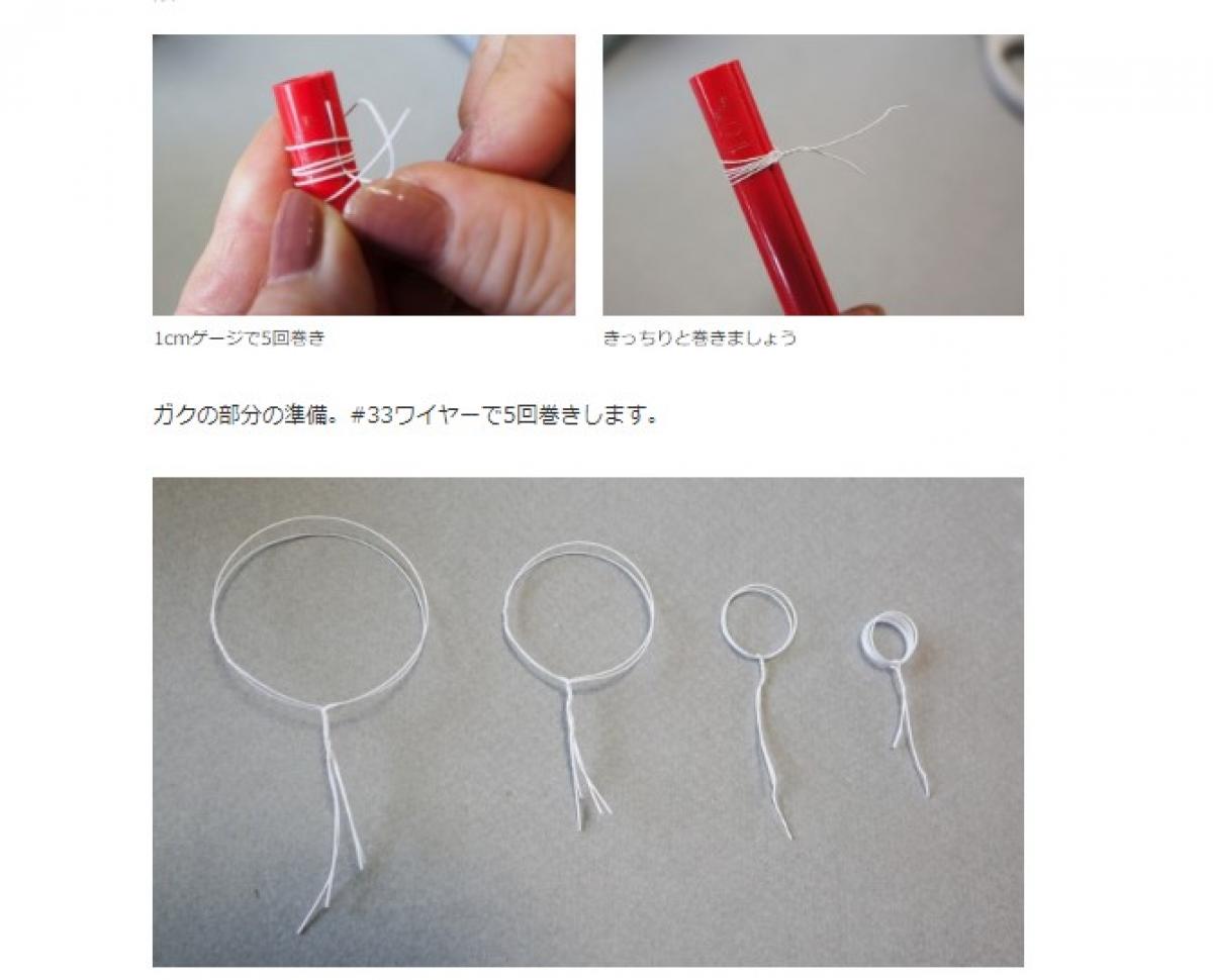 外側の花びら(A)の準備。20cmに切った#30ワイヤー2本を、端から5cmくらいのところで7回(1cm幅)くらいねじります。そのワイヤーを4cmのゲージで巻きます。